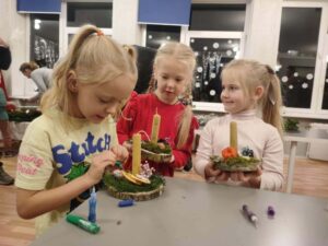 Adventas – turbūt pats jaukiausias ir stebuklingiausias laikas metuose. Nepaisant to, kad prieššventiniu laikotarpiu visi kažkur skubame, stengiamės iki metų galo nudirbti nebaigtus darbus, į mūsų darželį (Lydos g.) sugūžėjo grupių „Kaštoniukai“ ir „Riešutėliai“ tėveliai. Džiaugiamės, kad visi drauge galėjome pasidalinti laukimo džiaugsmu, pabūti šalia, pajausti ore skaldantį gėrį, jaukumą, paprastumą. O ir veiklos tikrai netrūko: pristatytas tarptautinio savanorio Omar Mammadli inicijuotas šešėlių teatro vaidinimas įtraukiant vaikus; sukurtas vaikų, tėvelių ir mokytojų Advento vainikas; kiekviena šeima pasigamino po stalo dekoraciją su vaško žvakele. Nuoširdžiai dėkojame visiems dalyvavusiems. Renginio organizatorės, mokytojos: Akvilė Bušininkaitė, Loreta Elinskienė bei Tatjana Andrijauskienė.