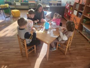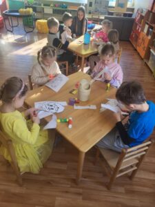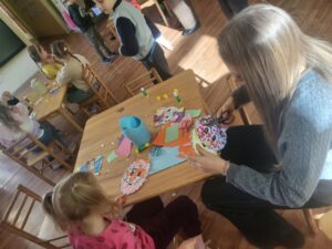 Vėliau mokinukės pasiūlė kartu pasigaminti Užgavėnių kaukes: išsikirpo, nuspalvino, dekoravo įvairiomis medžiagomis, kartu kūrė linksmus ir išraiškingus personažus. ![]()