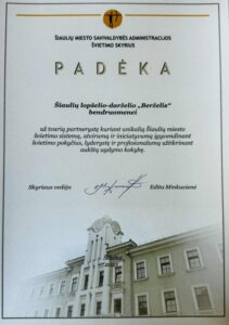 Dėkingi Šiaulių miesto savivaldybės Švietimo skyriaus vedėjai Editai Minkuvienei už Šiaulių lopšelio-darželio „Berželis” bendruomenės įvertinimą