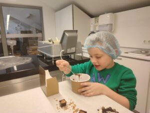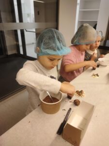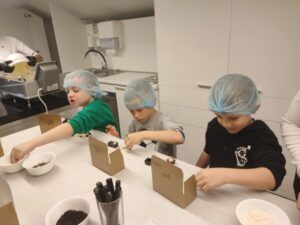 Vaikai ne tik klausėsi įdomios edukacijos apie šokolado kelią nuo pupelės iki saldainio, bet ir patys gamino saldainius – maišė, tepė, stebėjo, kaip šokoladas stingsta, dekoravo šokoladą ir, žinoma, ragavo savo kūrinius!