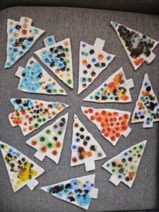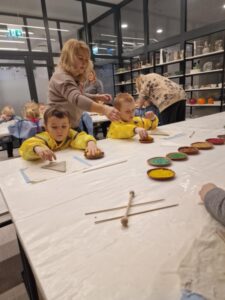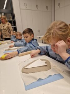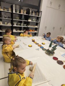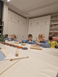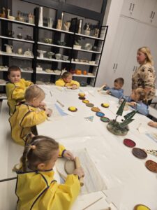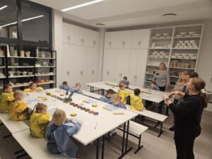 Lapkričio 24 d. grupių „Šermukšniukai“ ir „Žirginėliai“ ugdytiniai dalyvavo Šiaulių kultūros centro organizuotoje edukacijoje „Molio ir stiklo draugystė“. Tai buvo kupina atradimų, kūrybos ir patyriminio mokymosi veikla, leidusi vaikams iš arti susipažinti su moliu, jo savybėmis ir dekoravimo galimybėmis. Edukacijos metu vaikai tyrinėjo molį – jį minkė, kočiojo, stebėjo, kaip jis kinta liečiant ir spaudžiant. Mažieji kūrėjai taip pat susipažino su spalvotais stikliukais: skaičiavo, kiek jų yra, aptarė įvairias spalvas, lygino jų atspalvius ir spindesį. Tai buvo puiki proga lavinti ne tik kūrybiškumą, bet ir matematinį bei kalbinį suvokimą. Kiekvienas vaikas iš molio lipdė savo kalėdinę eglutę, kurią vėliau dekoravo ryškiais stiklo gabalėliais. Sukurti darbai buvo palikti išdegimui – šiame etape molio kūriniai virsta tvirtais ir ilgalaikiais meno darbais. Ugdytiniai su nekantrumu laukė, kol galės pamatyti galutinį rezultatą, o gavę išdegintas eglutes labai džiaugėsi savo unikaliais kūriniais.