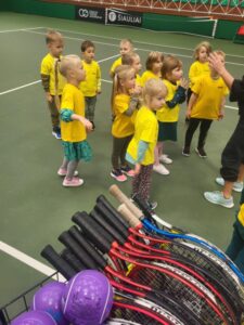 Mūsų darželis dalyvauja „Lietuvos teniso sąjungos” inicijuotame JTI projekte, skirtame teniso sporto integracijai ugdymo įstaigose. Tad 2025 m. spalio 14 dieną „Kaštoniukai” grupės ugdytiniai kartu su mokytojomis dalyvavo pažintinėje teniso treniruotėje Šiaulių teniso akademijoje. Treniruotės metu trenerė aprodė teniso kortus, supažindino su pagrindinėmis žaidimo taisyklėmis, parodė kokios būna raketės ir kaip taisyklingai laikyti ir mušti kamuoliuką.![]()