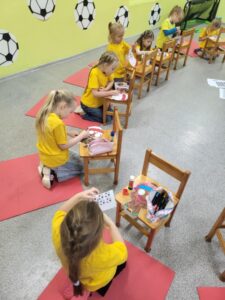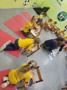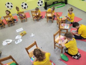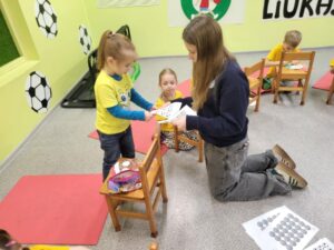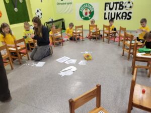 Lapkričio 20 d. mūsų įstaigoje SKU veiklą atliko Šiaulių Jovaro progimnazijos 7 klasės mokiniai. Jie pasiūlė „Riešutėliai“ grupės ugdytiniams sporto salėje atlikti mankštą, pagaminti žiemos akcentus sporto tematika. Šį kartą vaikai darbelius atliko ant netradicinio stalo – tam panaudota sporto salės įranga, suteikianti veiklai naują, dar nepatirtą pojūtį. Netikėta erdvė ir įdomi darbo vieta paskatino vaikus drąsiai išbandyti kitokius kūrybos būdus, įsitraukti, bendradarbiauti ir patirti džiaugsmą kuriant žiemiškas dekoracijas. Veiklos metu buvo ugdomas smulkiosios motorikos lavinimas, kūrybiškumas, iniciatyvumas bei gebėjimas dirbti komandoje. Ačiū už gerą laiką septintokams. Iki sekančio karto!